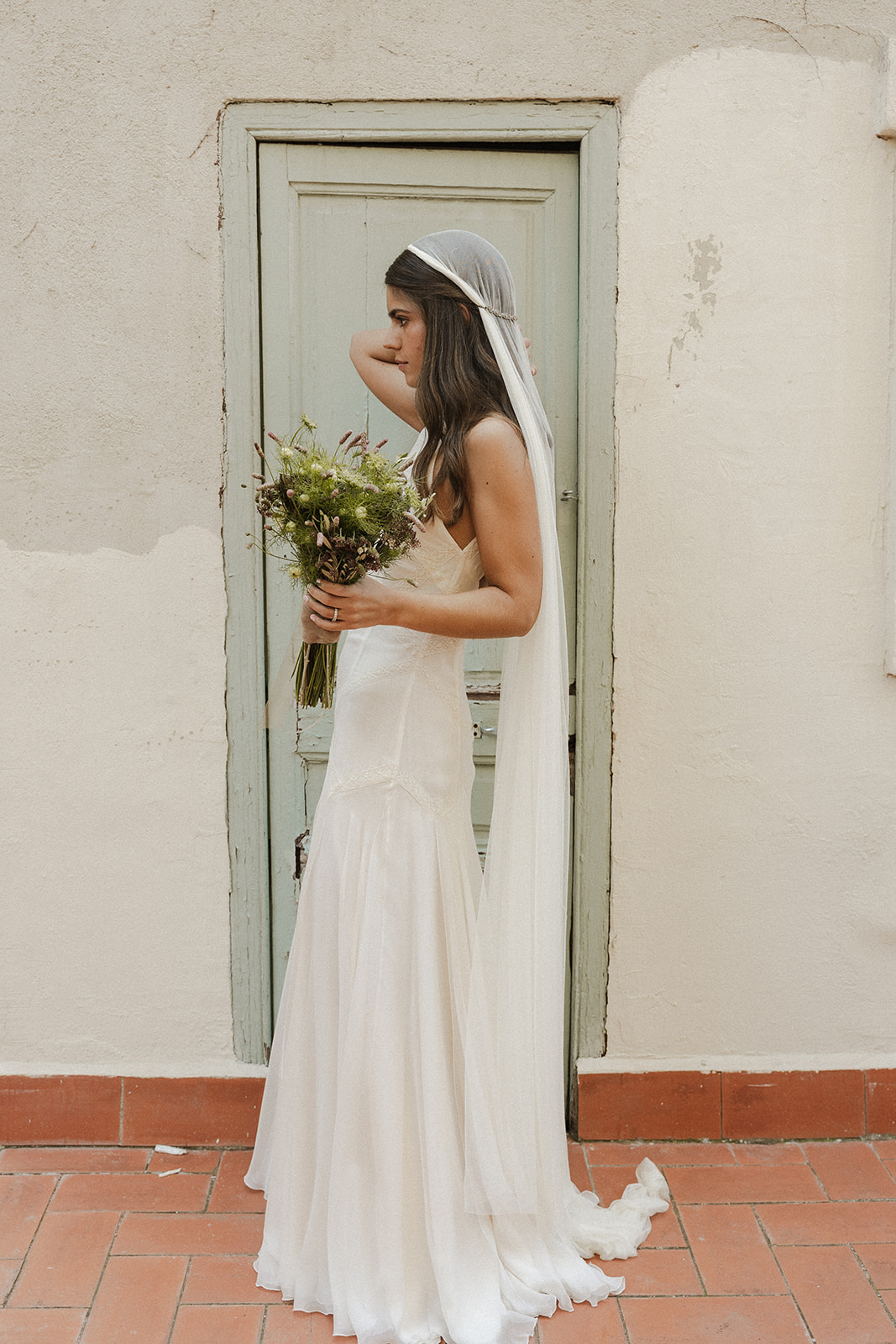 Para su gran día Silvia no quiso renunciar a la comodidad ni a un punto ‘rockero’ y por ello apostó por un estiloso diseño de Marta Martí Atelier, un dos piezas compuesto por body interior de encaje junto a una falda de seda con godets con transparencias junto a unas impresionantes sandalias glitter Jimmy Choo, unos pendientes en recuerdo de su abuela, una corona dorada de Gloria Veláquez y maquillaje y peluquería de Silvia Puche.