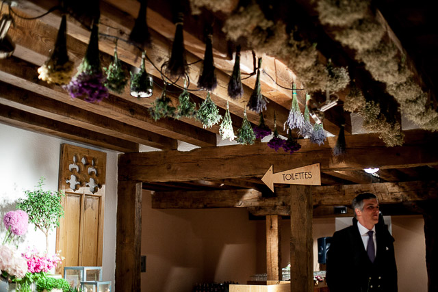 Tras la ceremonia, y a lomos de un seiscientos vintage color vainilla se dirigieron hacia el espacio De natura de Samantha de España, cuyos salones de estructura de madera vista, las chimeneas, el suelo de barro antiguo y la decoración floral de Floreale creaban un ambiente acogedor y mágico y bien podría estar en nuestra súper lista de espacios originales para bodas que tanto os gustó.
