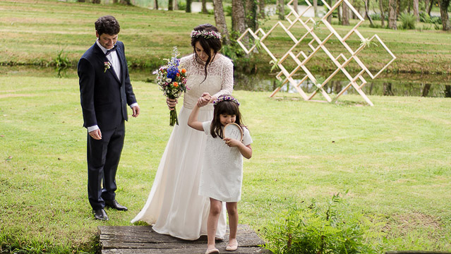 Además de los arreglos florales de todo el espacio, incluyendo los del banquete, también se encargaron de diseñar los originales regalos para los invitados: unos preciosos llaveros personalizados con el nombre de quien lo recibía fabricados con cortes de un roble de casa de la novia. Un apunte sentimental que le da un valor añadido al detalle del que ya sabes somos unas auténticas fans.