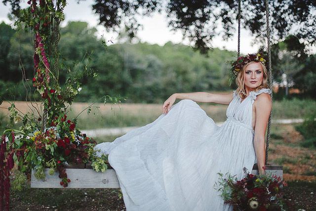 Una paleta de colores que se funde con el ambiente en los que brillan el mostaza, el rojo aterciopelado y el color higo en una velada para dos en un recóndito lugar para albergar pasiones. Momentos especiales para soñarte como una novia bohemia de otoño y descubrirte en un claro del bosque dejándote llevar tanto por el galope de un caballo como por el vaivén de un columpio .