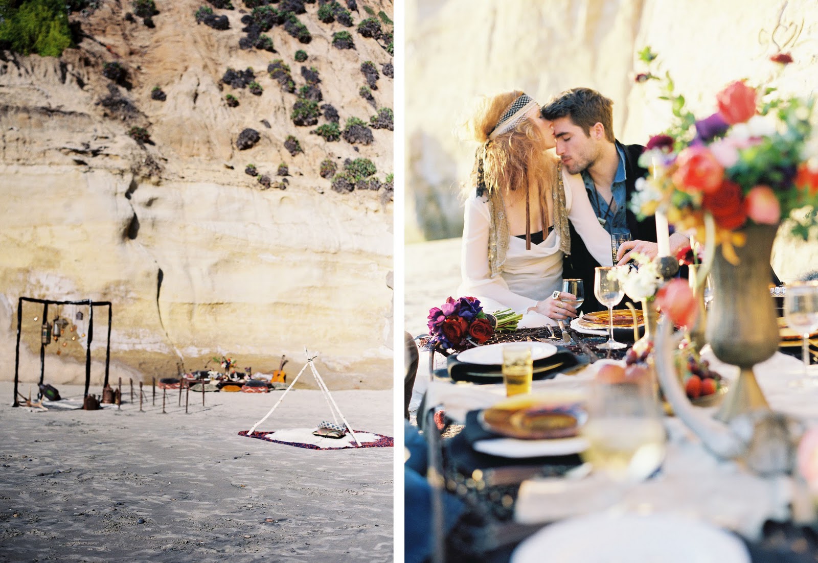Encontramos un toque mágico y místico en toda la decoración, especialmente el altar adornado con multitud de velas y farolillos metálicos, la pequeña jaima montada con preciosas telas, la mesa policromática adornada con frutas y flores silvestres, los puffs y las guitarras y por supuestísimo, nos encantan los espectaculares looks de los novios y de sus invitados, apostando por un estilo más campero en un ambiente de playa.