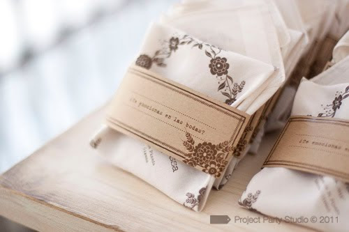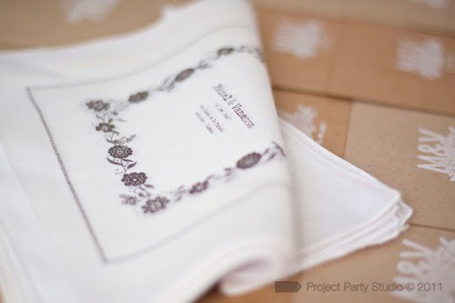Pero la invitación no acaba aquí, el pack contenía un pañuelo serigrafiado en chocolate con una guarda de flores y espigas diseñada a partir del logo, lo presentamos rodeado con una banda de papel kraft.