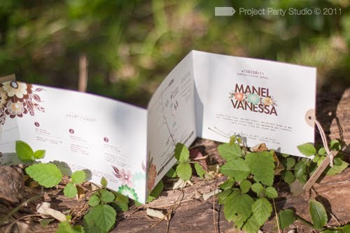 Diseñamos un pack totalmente fuera de serie, con materiales rústicos, colores suaves y con toques puntuales de colores intensos, totalmente handmade. Incluso el papel de la tapa imitaba las vetas de la madera y para cerrar la invitación usamos un lazo de tela deshilachada y un cartelito con nombres y fecha de la boda.