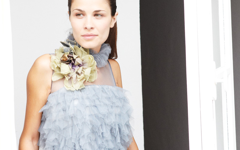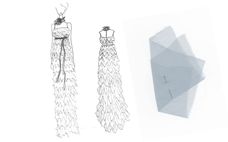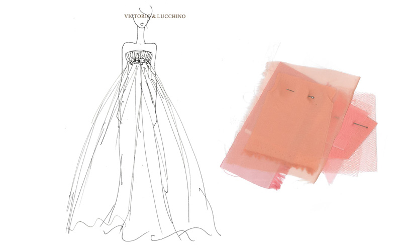 En cambio, el vestido Pinot Noir está realizado en tul de seda con adornos florales en forma de rosas en el escote. Una cinta de terciopelo en contraste se anuda a la cintura, dando lugar a una serie de volantes que recorren el largo del vestido “in crescendo” en tamaño hasta los pies.