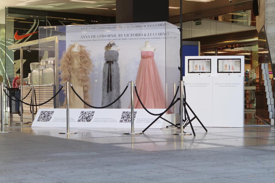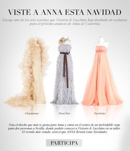 Eran unos preciosos vestidos de los grandes diseñadores españoles Victorio y Lucchino, expuestos ante el viandante para ser elegidos como el próximo traje de noche que Anna de Codorniu, símbolo de la empresa catalana de cava, llevará en el spot publicitario que cada año realizan por Navidad.