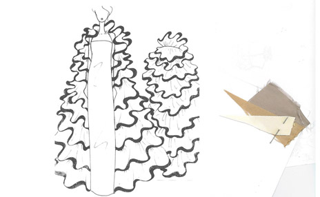 Según han contado los diseñadores sevillanos, el modelo Chardonnay, está realizado en Dupion de Seda, al bies con escote palabra de honor, alargando la figura por sus líneas sencillas y rectas hasta los pies. Un abrigo de encaje de tul de seda con cintas de nylon coloreada rematando los volantes, fruncidos de capa complementa el conjunto.